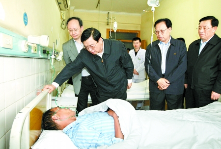 紧急会议之后,张德江还在徐光春的陪同下赶赴平煤集团总医院,在重症监护室和整形烧伤病区逐一看望在事故中受伤的14位伤员。张德江向伤员们转达了来自党中央、国务院和胡锦涛总书记、温家宝总理的关切和问候,并鼓励他们坚定战胜伤病的信心、积极配合医护人员的治疗,争取早日康复,重新走上生产第一线。听取了医院主要负责同志对伤员伤情的介绍后,张德江殷殷嘱托医护人员,这次事故引起了党中央、国务院的高度重视,平煤总医院高度重视伤员救治工作,措施坚强有力,工作尽职尽责,使伤员都得到了及时有效的治疗,从目前看伤员伤势平稳,我们十分满意。但这些伤员尤其是重伤员都是综合性创伤,下一步治疗和护理任务将更加艰巨,切不可掉以轻心。要组织最好的医疗力量,动用最好的设备和药品,确保伤员都能够得以康复,国家有关部委将给予全力支持。