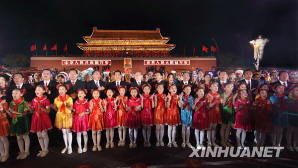 10月1日晚,首都各界群众在北京天安门广场举行盛大联欢晚会,热烈庆祝中华人民共和国成立60周年。党和国家领导人胡锦涛、江泽民、吴邦国、温家宝、贾庆林、李长春、习近平、李克强、贺国强、周永康等同各界群众共同欢度国庆之夜。新华社发