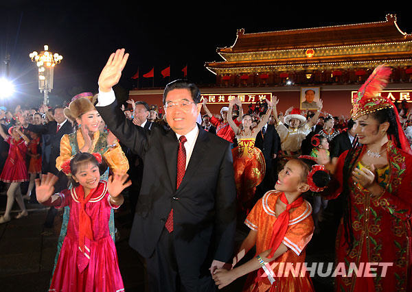 10月1日,首都各界庆祝中华人民共和国成立60周年联欢晚会在北京天安门广场举行。这是中共中央总书记、国家主席、中央军委主席胡锦涛走出天安门城楼,来到群众中间。新华社记者 兰红光 摄