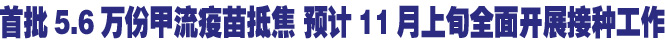 焦作日报讯 (记者付首鹏) 10月29日,记者从市卫生局获悉,首批5.6万份甲型H1N1流感疫苗已于本月27日抵达我市,目前,市卫生系统正在对疾控机构、接种机构和接种人员进行疫苗接种前的培训工作,预计11月上旬,我市将全面开展甲型H1N1流感疫苗的接种工作。
