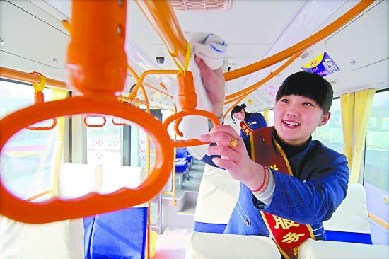12月24日上午,焦郑城际公交乘务员尚银晶身着一身蓝色工装,正在认真擦洗车窗。记者注意到,乘务员的这身衣服和飞机上空姐的着装非常相似。
