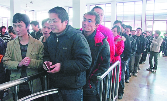 图为学生们正在排队购买回家的火车票。