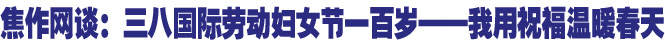 “我用一缕春风,二滴夏雨,三片秋叶,四朵冬梅,织成五颜六色的礼盒,结着七彩八飘的丝带,用九分真诚十分热情装进永恒的祝福:祝妇女节快乐!”网友【落叶】的这一篇祝福帖子让这个节日充满了浓浓的深情。在“三八国际劳动妇女节”一百周年之际,让我们用最真切的祝福和心声,温暖整个三月……