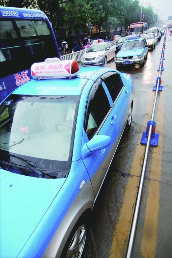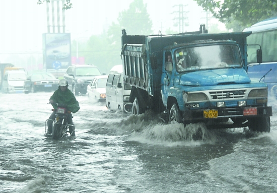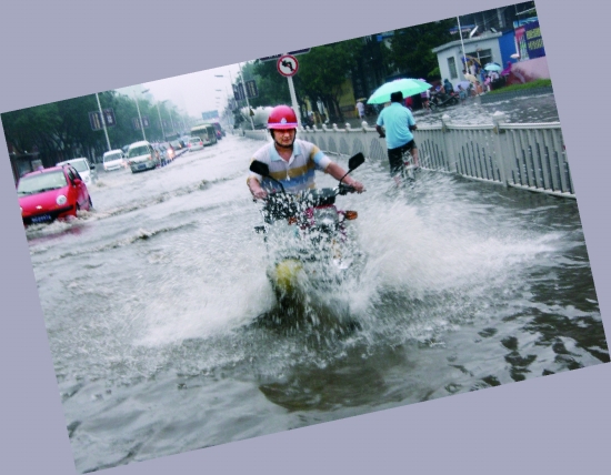 图② 积水过深,一些车辆在行驶中抛锚,导致道路拥堵。