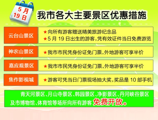 5月19日当天,我市各大主要景区都有较大幅度打折、优惠(具体请见图表)。