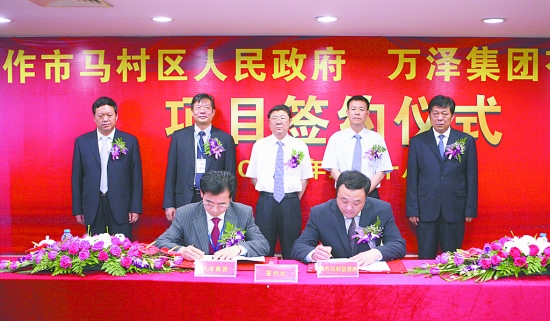 本报讯(特派记者董柏生)由深圳万泽集团有限公司与马村区人民政府合作建设的新材料产业园项目,5月18日上午在深圳举行了签约仪式,市委书记路国贤,市委常委、副市长赵建军出席签约仪式并鉴签。