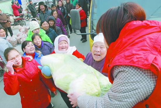 处于困境中的菜农,听说爱心菜要免费送给城市低保户,纷纷走进田间,挑选个大饱满的大白菜,分装入袋。菜农还自己找来三轮车,将一包包蔬菜从地头运出,然后装上爱心车。16日当天,两辆爱心车将5万公斤爱心菜连夜从田间地头运到活动筹备现场。
