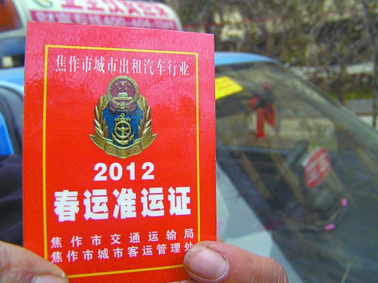 昨日上午,的哥张亚利开心地把一张2012春运准运证贴在了自己的车上。