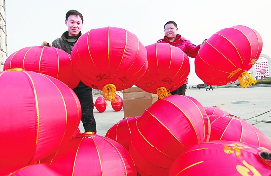 图 市龙源湖公园内,工作人员正在布置元宵节猜灯谜现场。 本报记者 赵林峰 摄 |