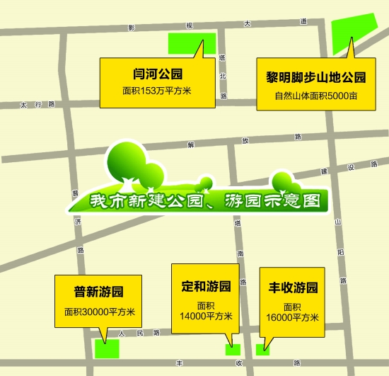 分别命名为黎明脚步山地公园、闫河公园、普新游园、丰收游园、定和游园