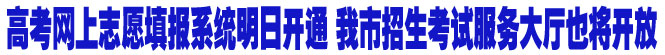 本报讯 (记者杨景鹏 实习生薛文娜) 高考结束后,经过一段时间的休整,考生们又将迎来一场“重头戏”——网上志愿填报。据了解,河南省招生办公室网站(www.heao.gov.cn)“网上志愿填报”系统将于明日开通。为了更好地服务考生,位于市学生路的我市招生考试综合服务大厅明日起也将对外开放,接受考生和家长的咨询。