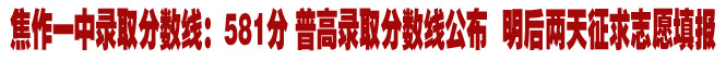 据了解,今年我市部分省、市级普通高中普通统招生录取分数线分别为:焦作一中581分、焦作十一中541分,焦作外国语中学480分,焦作十二中491分,焦作四中472分,修武一中566.5分,博爱一中557.5分,武陟一中571分,沁阳一中567.5分,温县一中565.5分,孟州一中527.5分。