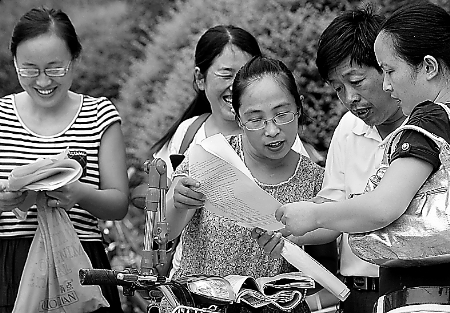8月9日,郸城县一高刚走出考场的几名教师正在交流应试答题情况。该校每年都要利用假期对教师进行两次培训,并进行学科知识测试,从而提升教学水平。今年,这个县级高中考上清华大学、北京大学的学生就达23名。本报记者 王天定 摄