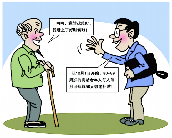 各县市区要将本地80周岁以上老年人纳入敬老补贴保障范围,按月向符合条件的老年人计发敬老补贴。对80~89周岁的老年人每人每月发放50元敬老补贴,90~99周岁的老年人每人每月发放200元敬老补贴,100周岁以上老年人每人每月发放500元敬老补贴,资金由各县市区财政负担。