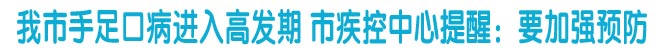 “当前我市手足口病总体发病水平低于往年同期,近年来医疗卫生机构已经积累了一套科学、规范的防治经验和办法,家长无须恐慌,但一定要重视孩子手足口病的预防。”任东说,市疾控中心对手足口病疫情进行了研判,5月份是我市手足口病发病高峰期,预计6月份发病水平开始降低,到秋末冬初可能会有一个小的疫情回升。根据疫情发展趋势,市卫生局和疾控中心已经要求各地要根据本地疫情形势,适时启动疫情周分析,重点做好聚集疫情的监视和处置工作。