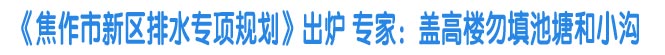 市规划设计研究院相关负责人毕记波介绍,《焦作市新区排水专项规划》充分利用现有沟渠,又新建了11条人工渠,使这些沟渠与地下排水管网相结合形成新区完整的排水体系。设计原则为充分利用景观湖、人工渠作为雨水受纳水体,道路雨水管网系统与人工渠、景观湖相结合,形成完整的排水体系。