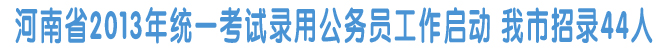 本报讯(记者杜玲 通讯员李良勇)备受社会关注的河南省2013年统一考试录用公务员工作启动。记者昨日从市人力资源和社会保障局获悉,河南省2013年统一考试录用公务员8月13日开始报名,全省计划招考3835人,其中我市招考44人。