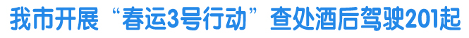 据介绍,“春运3号行动”中,市公安交警部门共查处酒后驾驶201起,其中醉酒驾驶9起;查处无证驾驶、客车超员和机动车涉牌涉证等交通违法行为100余起。