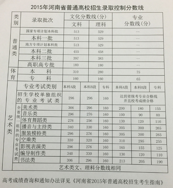 大河网讯(记者 许会增)今年,河南省一本线文科513分,理科529分;二本线文科455分,理科458分;三本线文科397分,理科383分。6月24日下午3时30分,河南省招生办公室召开新闻发布会,公布2015年河南省普通高校招生录取控制分数线。
