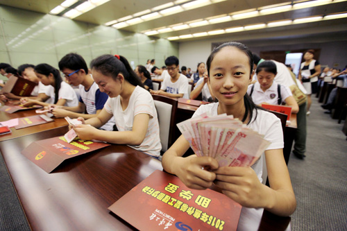 上图 寒门学子领取助学金。记者 赵林峰 摄
