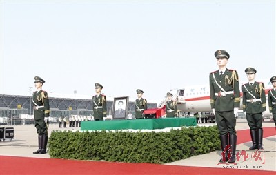 “起灵——”“敬礼——”烈士的骨灰被缓缓放上灵车,灵车缓缓启动,向烈士的故乡温县驶去。人们悲痛的目光一路追随着灵车,直到它在视野中消失。