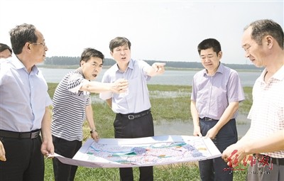 昨日上午,市委书记王小平在大沙河灵泉湖段检查防汛工作。