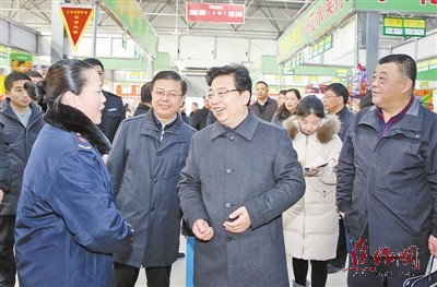 万鑫商城农贸市场内货品丰富,前来采购的市民人流如织。在销售摊点前,徐衣显与商户亲切交谈,询问食品价格、销售、质量等情况。在市场综合管理办公室和12315维权服务站,徐衣显详细了解农药残留检测、维权服务等情况。他叮嘱相关部门随行同志,要精心组织货源,确保物价平稳、质量可靠,同时要抓好食品、消防等安全工作,确保全市人民度过一个平安、祥和的新春佳节。