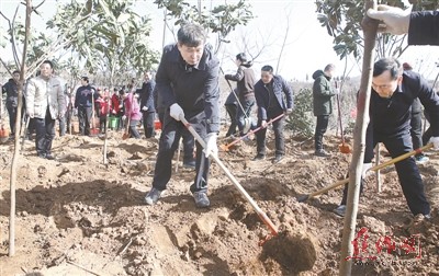昨日,市委书记王小平在解放区上白作街道洪河村老丁沟参加义务植树活动。记者 赵耀东 摄