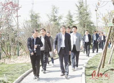 昨日,市委书记王小平等领导在孟州市北环路观摩绿色廊道建设情况。记者 刘 璐 摄