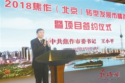 昨日,市委书记王小平在2018焦作(北京)转型发展市情推介暨项目签约仪式上致辞。 特派记者 赵耀东 摄