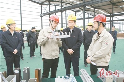 4月19日,市委书记、市人大常委会主任王小平等领导在沁阳市广东兴发铝业(河南)有限公司年产5万吨节能轻质高精铝型材项目现场观摩。