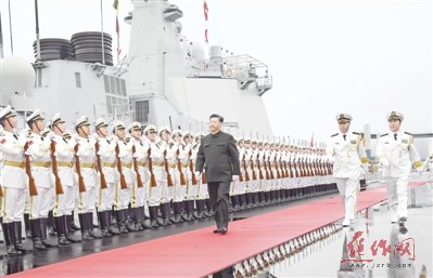 4月23日,在中国人民解放军海军70华诞之际,中共中央总书记、国家主席、中央军委主席习近平出席在青岛举行的庆祝人民海军成立70周年海上阅兵活动。图为习近平检阅海军仪仗队。