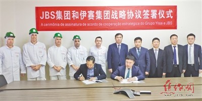 巴西是全球重要的肉牛养殖及牛肉生产加工国,王小平一行首先来到巴西的圣高萨度市,拜访市政府企业和政策咨询高级顾问爱华德·靳诺硕先生,详细了解巴西肉牛产业发展情况,并就两市开展合作达成共识。随后,王小平一行来到巴西最大的牛肉出口企业JBS集团。该集团是全球最大的动物蛋白和肉类加工企业,拥有42个牛肉生产加工基地,产品出口150多个国家和地区。在JBS集团,王小平一行参观考察了肉牛屠宰、分割包装、产品加工、物流配送生产线。经过双方深入交流,我市伊赛牛肉集团与JBS集团达成战略合作共识,签订了5年18亿美元的优质牛肉供应协议,一举拿到国内进口优质牛肉的最大单笔订单。