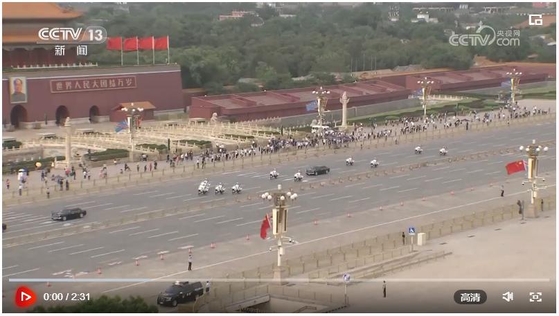 两国元首回到检阅台观看仪仗队分列式。