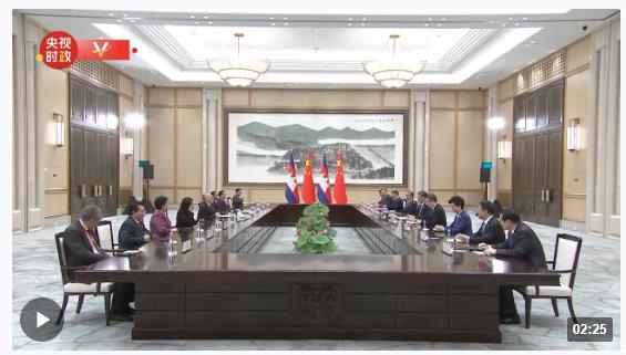 习近平指出,很高兴再次见到国王陛下。今年是中柬建交65周年和中柬友好年。年初春暖花开之际,我们在钓鱼台国宾馆亲切会面。秋高气爽之时,我们又在西子湖畔重逢,共同见证杭州亚运会开幕。两国领导人像走亲戚一样常来常往,正是中柬命运共同体的生动体现。