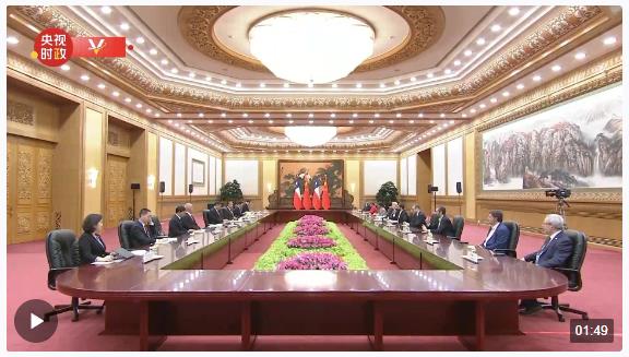 10月17日上午,国家主席习近平在人民大会堂同来华出席第三届“一带一路”国际合作高峰论坛并进行国事访问的智利总统博里奇举行会谈。