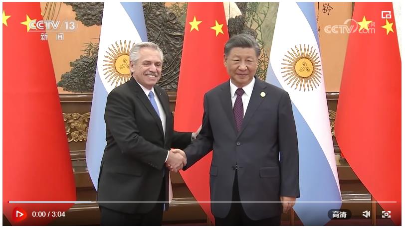 习近平祝贺阿根廷获邀加入金砖国家合作机制,指出中阿要在联合国、二十国集团、金砖合作机制等框架内加强战略协调,推进落实全球发展倡议、全球安全倡议、全球文明倡议,推动构建人类命运共同体。中方一贯支持拉美和加勒比地区一体化进程,愿同阿根廷和其他拉美和加勒比国家一道,推动中拉论坛建设和中拉关系发展。