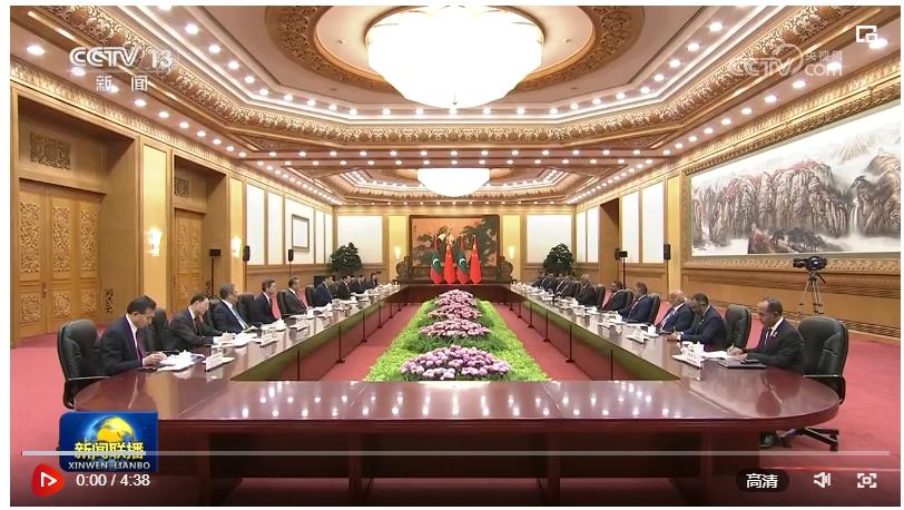 1月10日下午,国家主席习近平在人民大会堂同来华进行国事访问的马尔代夫总统穆伊兹举行会谈。两国元首宣布,将中马关系提升为全面战略合作伙伴关系。