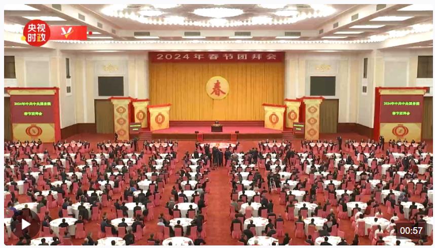中共中央、国务院8日上午在人民大会堂举行2024年春节团拜会。中共中央总书记、国家主席、中央军委主席习近平发表讲话,代表党中央和国务院,向全国各族人民,向香港特别行政区同胞、澳门特别行政区同胞、台湾同胞和海外侨胞拜年。