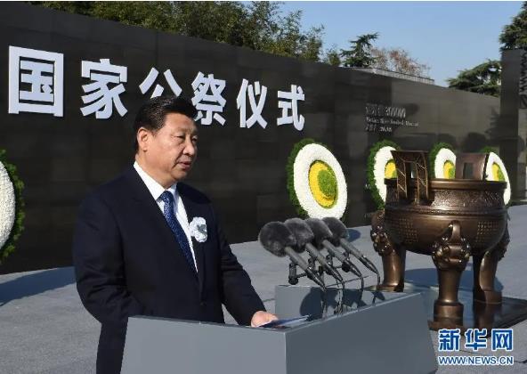 2014年12月13日上午,中共中央、全国人大常委会、国务院、全国政协、中央军委在南京隆重举行南京大屠杀死难者国家公祭仪式。中共中央总书记、国家主席、中央军委主席习近平出席并发表重要讲话。新华社记者 李学仁 摄