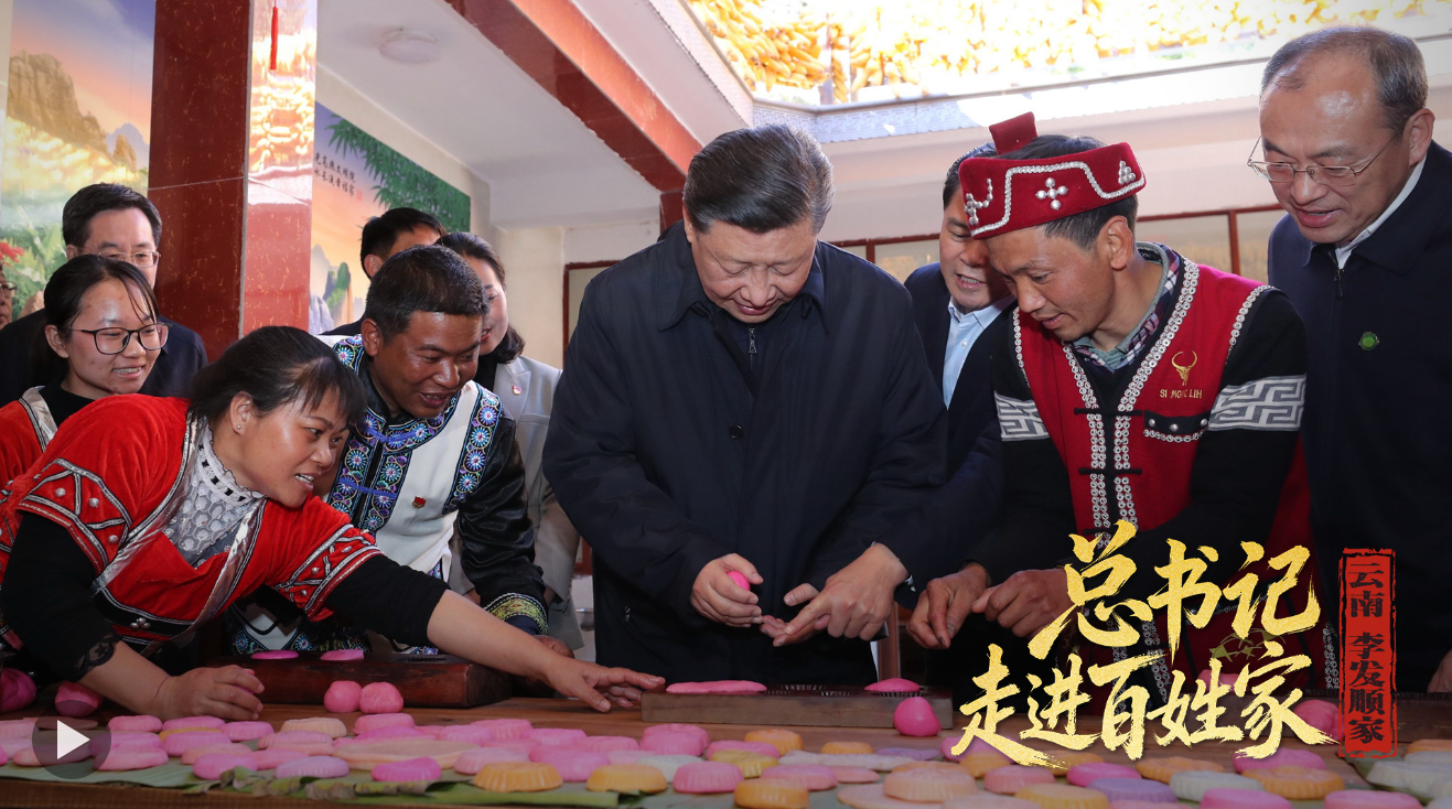 2020年春节前夕,习近平总书记走进云南腾冲市清水乡三家村中寨司莫拉佤族村,同村民李发顺一家制作当地节日传统食品大米粑粑。总书记一连做了两个,笑着说:“摁了个福字,再来一个喜字,有福有喜。”