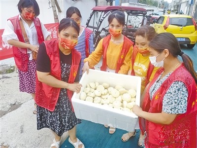 芦堡村巾帼志愿者将蒸好的包子送往防控一线。