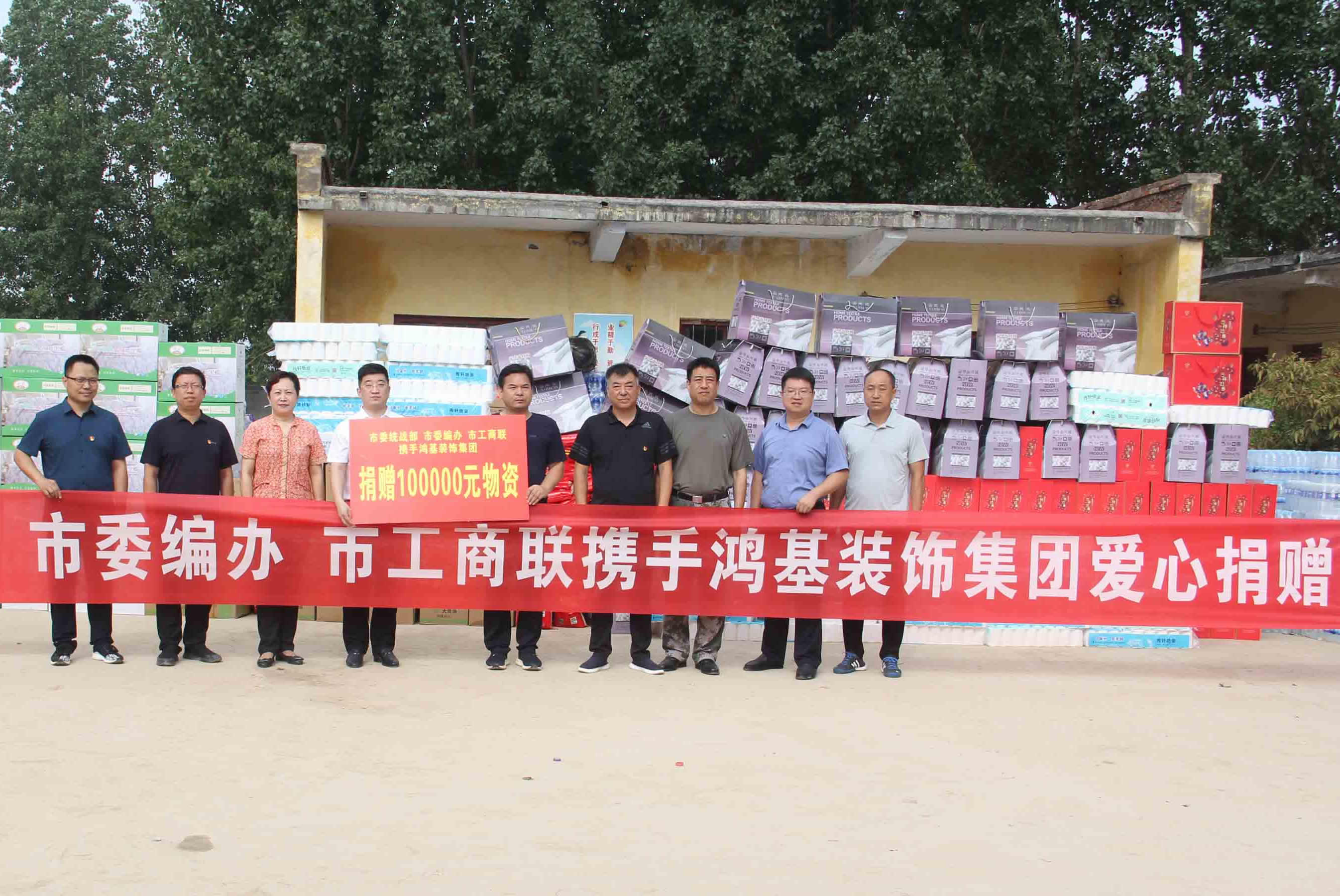 市委统战部、市委编办、市工商联携手鸿基装饰集团为该村受灾群众捐赠价值10万元的救灾生活物资...