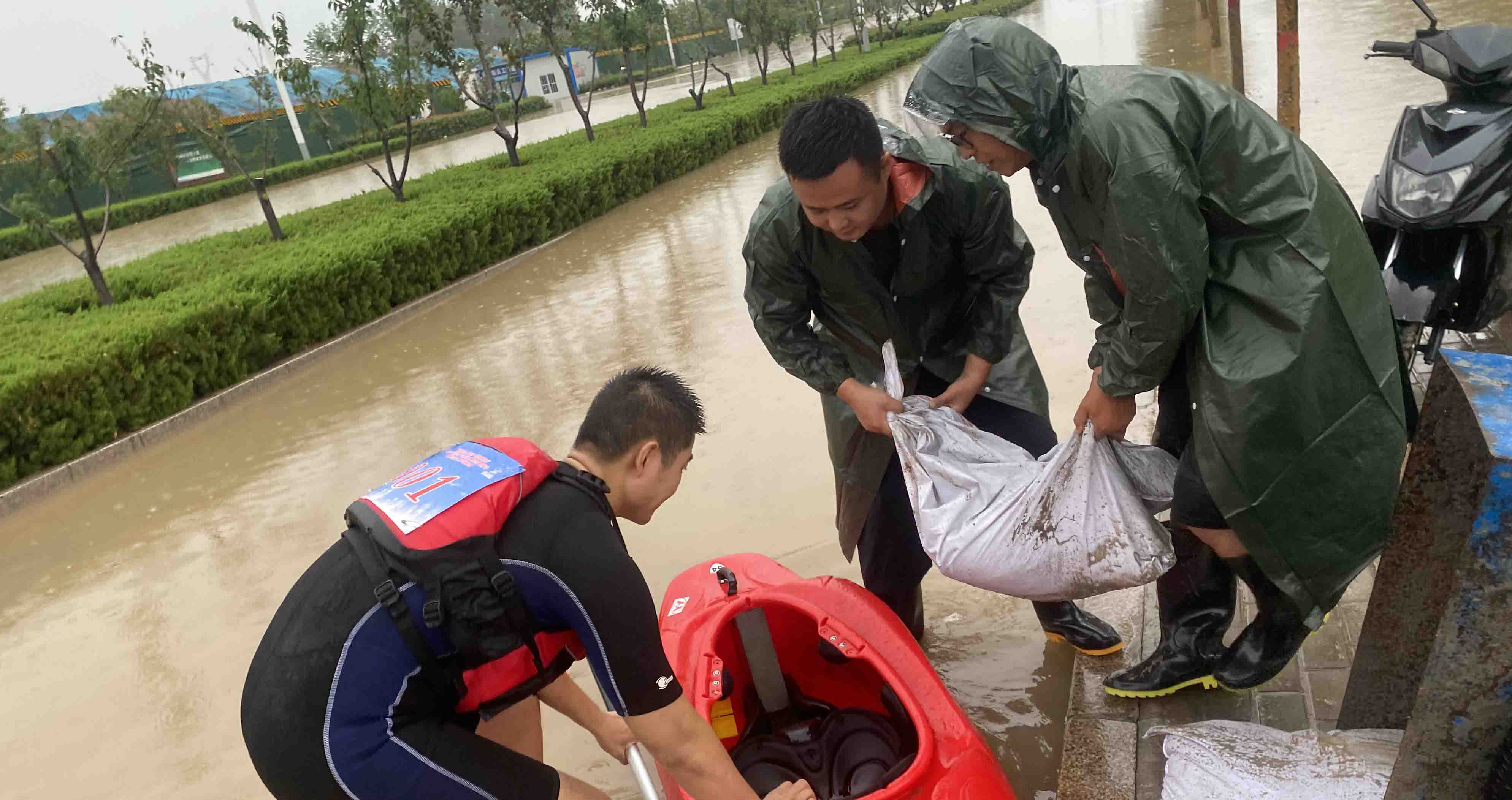 焦作市毛庆运动训练俱乐部教练员利用皮划艇运送沙袋。