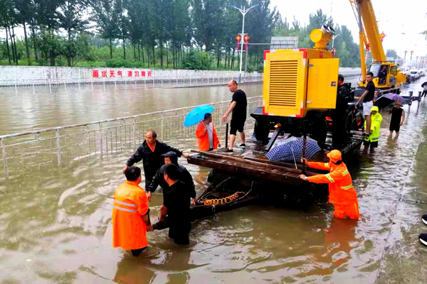 闻讯,市公路事业发展中心党委书记薛东来、主任刘志钢,以及班子领导李文峰、李新峰、王振武等第一时间赶赴现场,会同在现场的直属分中心主任胡增团紧急研究,决定立即调集一台吊车和一辆平板拖车,将临时抽水设备吊放到平板拖车上进行抽水作业。
