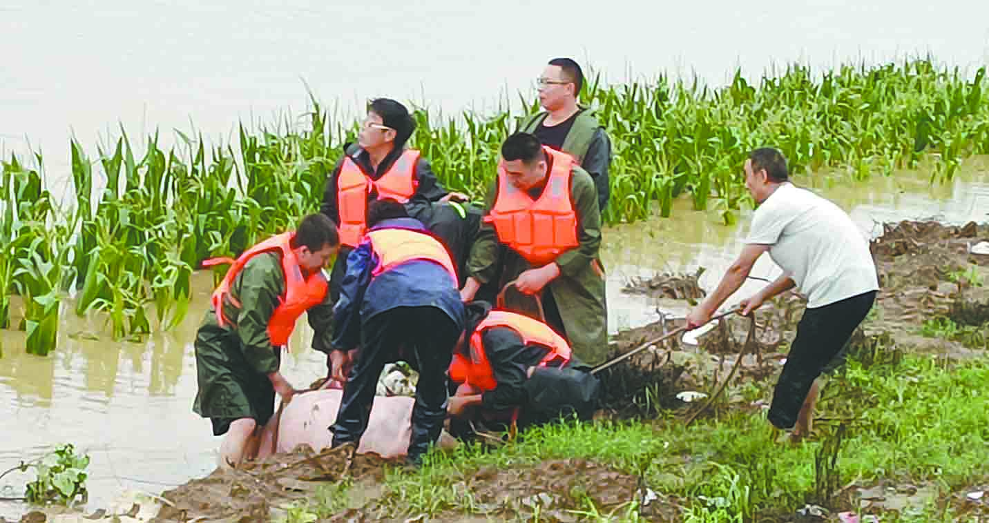 周庄镇干部群众全力抗洪抢险。