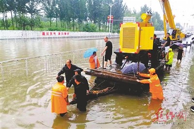 7月19日8时许,马村区文昌路待王立交桥北侧,随着一声令下,19名身着橘红色标志服的公路抢险队员,毫不犹疑地在齐胸深的积水中,手拉肩扛,将装载着大型临时抽水设备的平板拖车,一步一步,艰难地推向抽水位置。