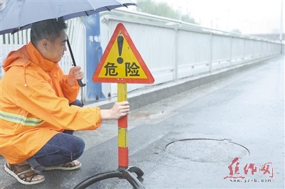 由于雨水排量大,井盖被水压冲击不停翘起,焦作腾飞市政公司员工及时安放警示牌。