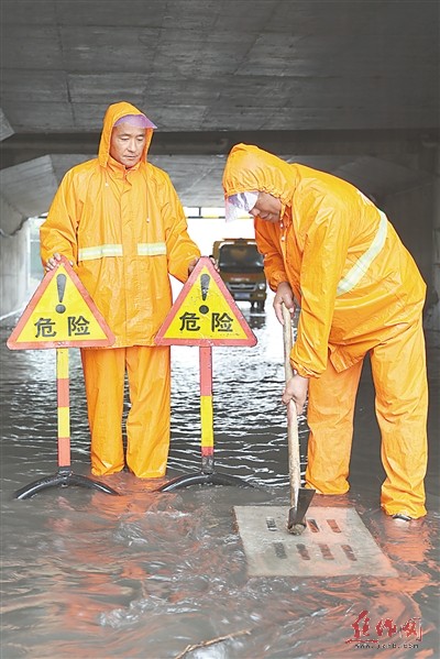 市政人员撬开地下出水口,加速积水排出。
