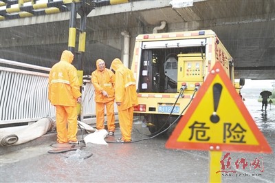 雨情就是命令。各值守点开始封堵路面,对铁路桥下的积水进行抽排水作业。在一阵阵抽水泵轰鸣声中,积水逐渐消退。